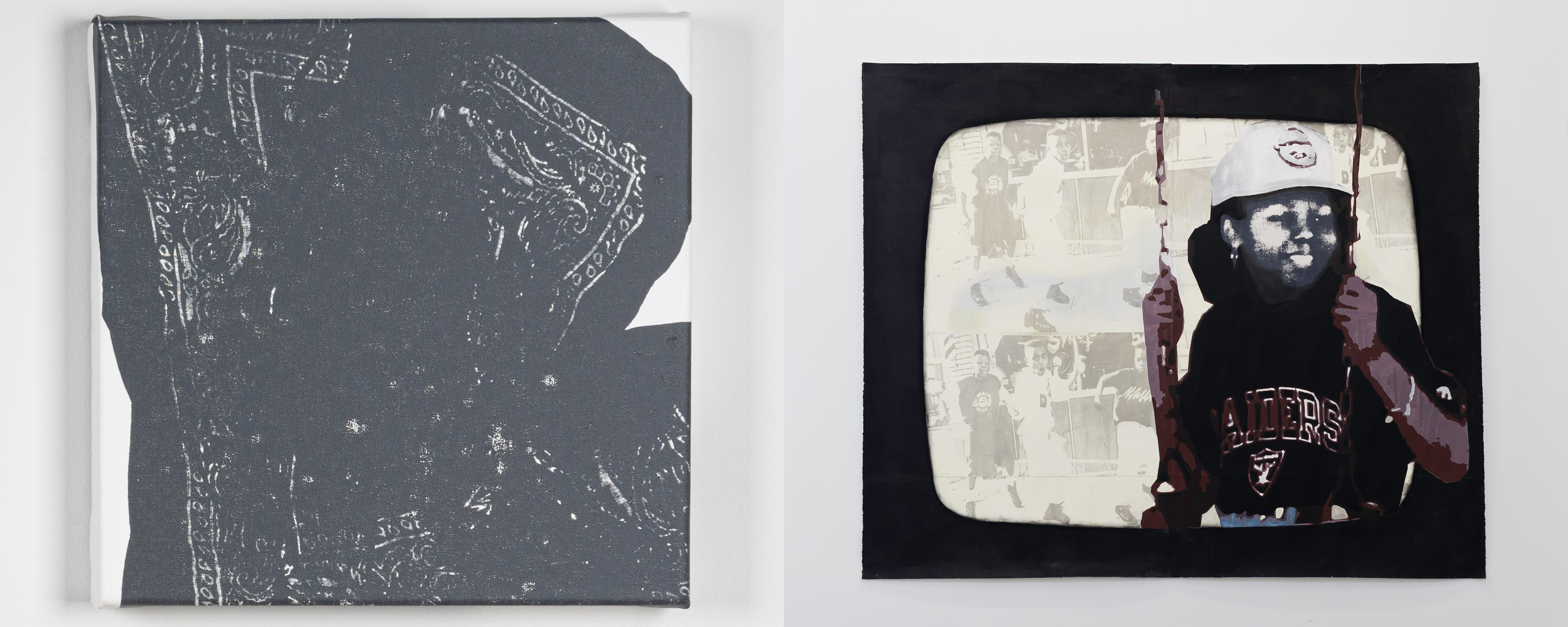 Left: Leslie Diuguid, "Jessica," single color screenprint with acrylic ink on canvas 12 x 12 in. 2024